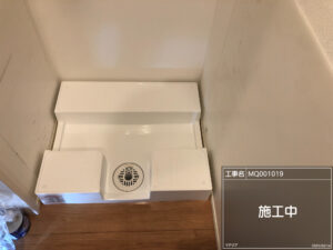 🔻既存の洗濯機台キャスターブレーキ付きを撤去し、床下排水配管の接続を行い、新しい洗濯機パンを設置致しました。